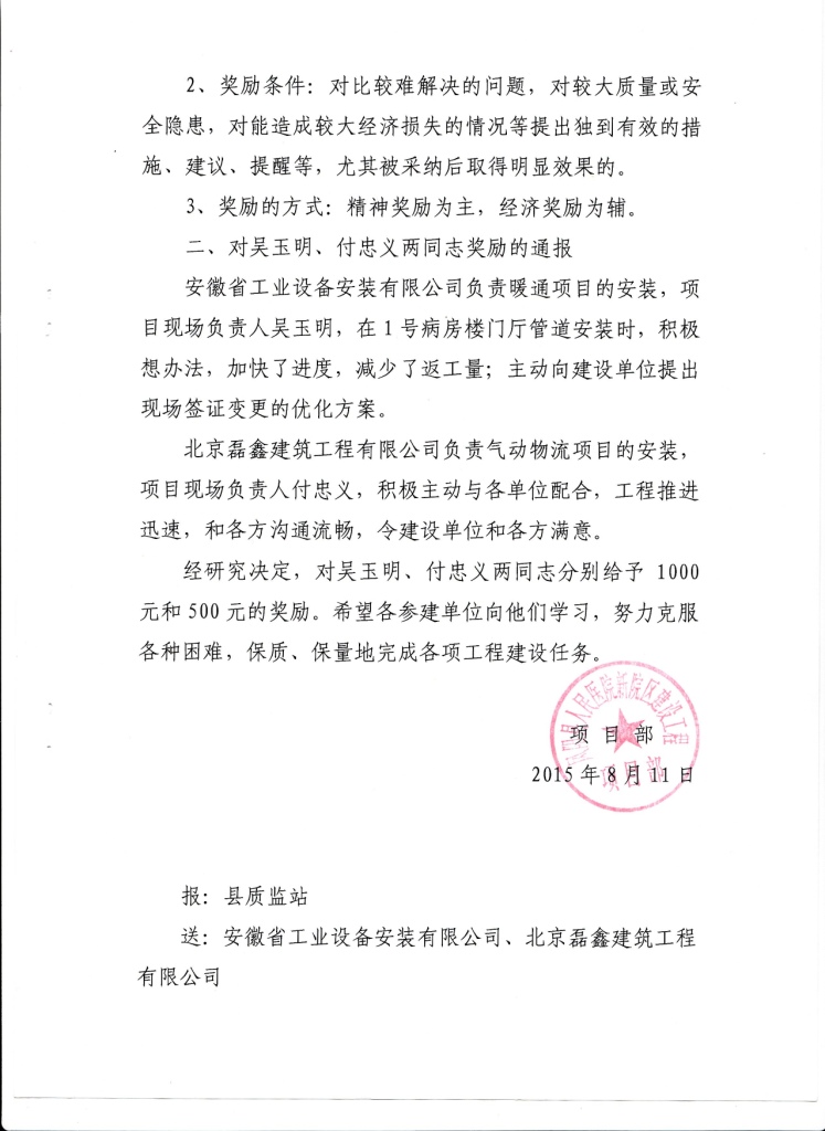 8月11日,鳳陽縣人民醫(yī)院新院區(qū)建設工程項目部發(fā)來賀文,就公司第九分公司承攬的鳳陽縣人民醫(yī)院新院區(qū)暖通項目安裝工程表示肯定,并對該項目的現(xiàn)場負責人吳玉明同志給予表彰和獎勵通報。