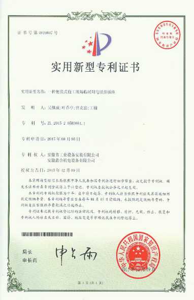 近日,從國家知識(shí)產(chǎn)權(quán)局傳來喜訊,公司申報(bào)的“一種便攜式施工現(xiàn)場(chǎng)臨時(shí)用電聯(lián)排插座”實(shí)用新型專利獲批,并頒發(fā)了國家實(shí)用新型專利證書。
