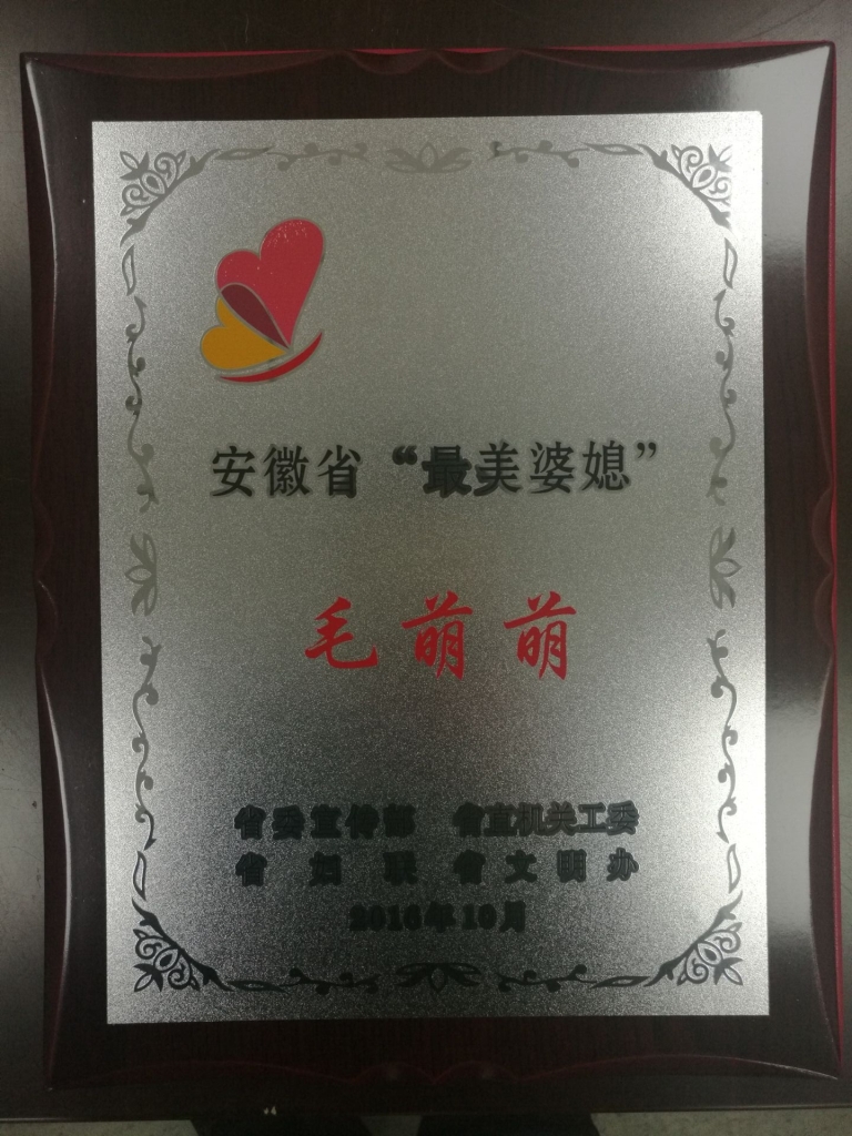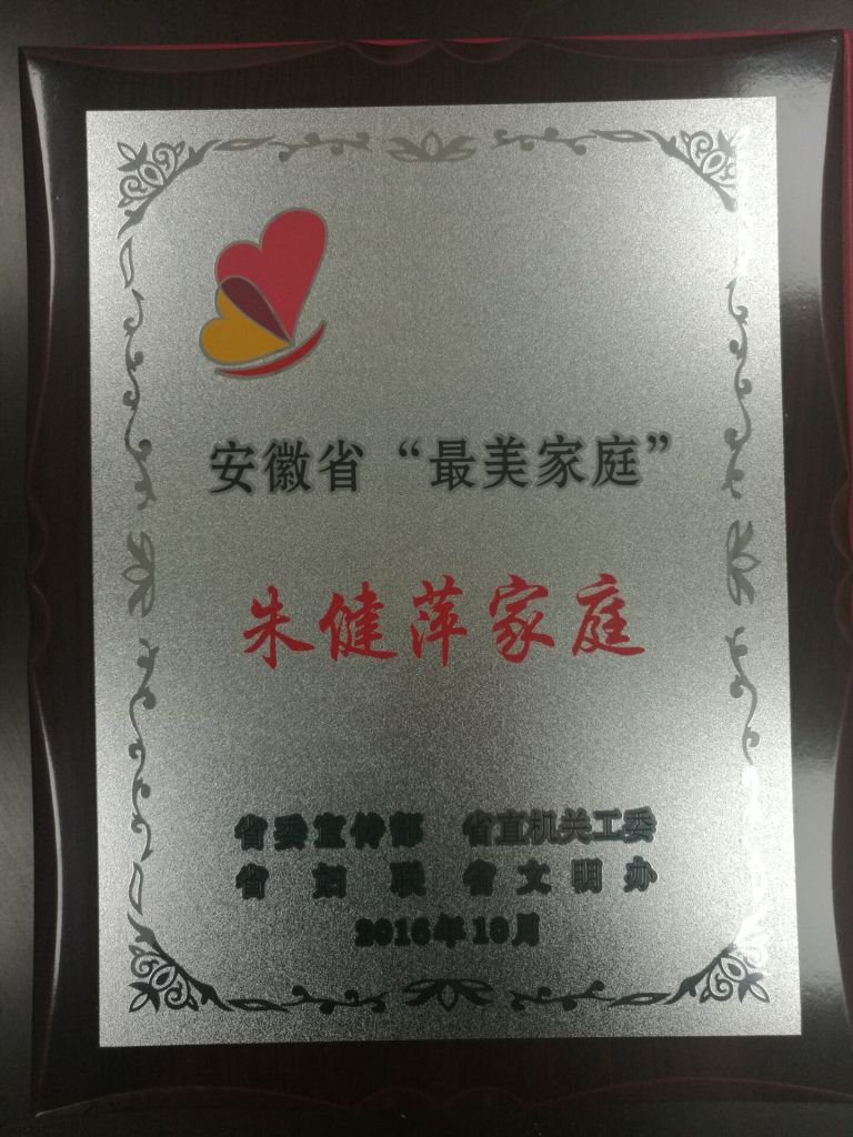 榮譽(yù),其中,我公司朱健萍家庭、毛萌萌分別被授予安徽省2016年度“最美家庭”