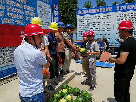 6月18日一大早,項(xiàng)目負(fù)責(zé)人攜管理人員,帶著粽子、西瓜、白糖等慰問品,為奮斗在一線的工人帶去一份份節(jié)日的問候和祝福,并叮囑大家規(guī)范操作,遠(yuǎn)離三違,安全生產(chǎn)。
