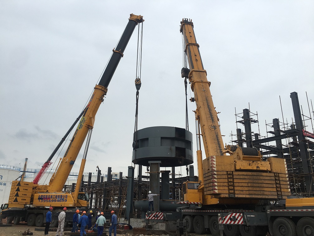 本次吊裝的反應(yīng)器中段部分重達(dá)220噸,分公司領(lǐng)導(dǎo)高度重視,吊裝前期,邀請(qǐng)公司總工吳繼成、總工辦主任牛守義和安全部王岳濤經(jīng)理親臨項(xiàng)目部參與設(shè)備吊裝的專題方案討論定稿工作。當(dāng)日上午,吊裝現(xiàn)場(chǎng)準(zhǔn)備工作緊張卻又有條不紊的進(jìn)行,項(xiàng)目經(jīng)理李子鳳向全體“參戰(zhàn)”員工進(jìn)行了安全交底,工作人員對(duì)兩臺(tái)分別為500T、350T吊車的站位及性能再次確認(rèn),現(xiàn)場(chǎng)機(jī)具、人員均按既定方案實(shí)施。分公司經(jīng)理史崇松、業(yè)主單位負(fù)責(zé)人、監(jiān)理全程在現(xiàn)場(chǎng)“督戰(zhàn)”,全體工作人員經(jīng)過(guò)四個(gè)小時(shí)的奮戰(zhàn),吊裝作業(yè)圓滿結(jié)束。