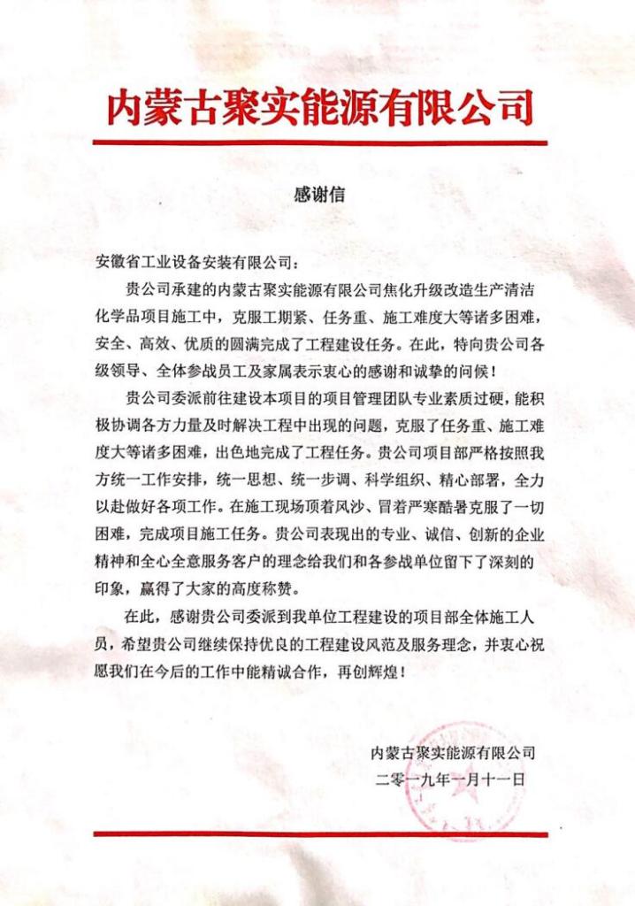 2019年1月14日,安徽安裝承建的內(nèi)蒙古聚實(shí)能源有限公司焦化升級(jí)改造生產(chǎn)清潔化學(xué)品項(xiàng)目,克服工期緊、任務(wù)重、施工難度大等諸多困難,安全、高效、優(yōu)質(zhì)的圓滿完成了工程建設(shè)任務(wù)。業(yè)主內(nèi)蒙古聚實(shí)能源公司總經(jīng)理張春軍向公司贈(zèng)送內(nèi)容為“力克萬難 保中交節(jié)點(diǎn);眾志成城 創(chuàng)優(yōu)質(zhì)履約”的錦旗。