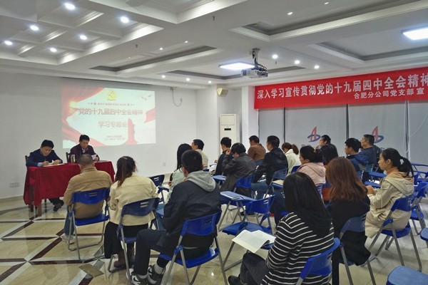 為深入學(xué)習(xí)宣傳貫徹黨的十九屆四中全會(huì)精神,打牢政治基礎(chǔ),堅(jiān)定政治方向,11月13日下午3點(diǎn),合肥分公司黨支部在公司十五樓職工之家組織召開(kāi)黨的十九屆四中全會(huì)精神學(xué)習(xí)專題會(huì),分公司領(lǐng)導(dǎo)班子成員、機(jī)關(guān)全體黨員干部及在肥項(xiàng)目部人員參加了會(huì)議,會(huì)議由黨支部書(shū)記胡迎東主持。