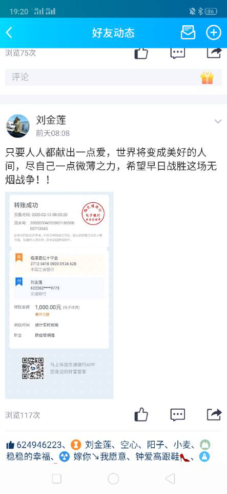 她就是寧夏辦事處職工劉金蓮?fù)?。劉金蓮?fù)驹诠ぷ髦姓J真積極,是一名陽光樂觀、任勞任怨的優(yōu)秀員工,她在平時生活工作中也總是積極主動的幫助他人。在這次疫情爆發(fā)后,2月13日,劉金蓮?fù)局鲃勇?lián)系當?shù)馗拭C省臨澤縣紅十字會,通過線上微信轉(zhuǎn)賬的方式,轉(zhuǎn)給紅十字會捐款人民幣1000元。接下來,她又主動聯(lián)系當?shù)丶t十字會工作人員,要求主動擔(dān)當志愿者,但是因為客觀原因,沒有被批準。