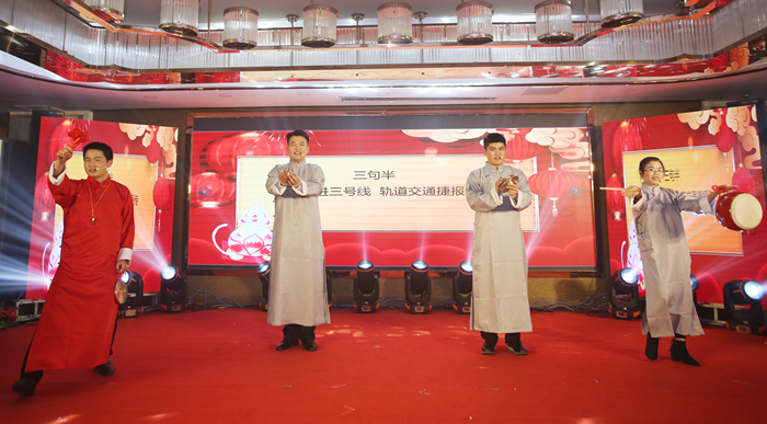 整場(chǎng)聯(lián)歡會(huì)由歌伴舞、朗誦、合唱、小品、樂(lè)器演奏、三句半、黃梅戲、音詩(shī)畫(huà)等16個(gè)節(jié)目組成,均為職工自編自導(dǎo)自演。在歌伴舞《今天是你的生日中》中,聯(lián)歡會(huì)正式拉開(kāi)序幕?!妒“操潯芬愿木幇纥S梅戲劇的形式為公司送上美好的祝愿;配樂(lè)詩(shī)朗誦《春風(fēng)浩蕩啟新程,揚(yáng)帆起航再出發(fā)》展現(xiàn)了安徽安裝人團(tuán)結(jié)奮進(jìn),一往無(wú)前的精神風(fēng)貌;三句半《拼搏奮進(jìn)三號(hào)線,軌道交通捷報(bào)傳》以幽默的方式講述了軌道交通3號(hào)線合肥大劇院站項(xiàng)目部上的故事;音詩(shī)畫(huà)《奮斗是青春最亮麗的底色》講述了新疆烏蘇管廊、中水回用項(xiàng)目榮獲“安徽省工人先鋒號(hào)”背后的故事,向全體奮戰(zhàn)在項(xiàng)目施工一線的安徽安裝人致敬...歡快的旋律,優(yōu)美的舞姿,幽默的小品,豪邁的朗誦將現(xiàn)場(chǎng)的氣氛推向高潮,贏得了現(xiàn)場(chǎng)觀眾的歡呼喝彩與陣陣掌聲。
