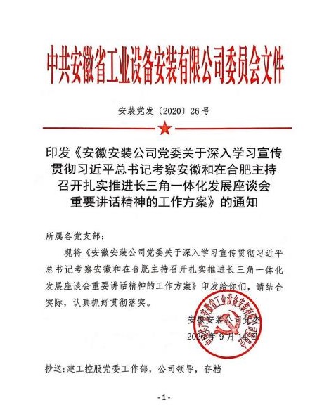 一是公司黨委迅速?lài)?yán)密部署學(xué)習(xí)宣傳貫徹各項(xiàng)工作。98日,公司黨委理論中心組率先帶頭,認(rèn)真學(xué)習(xí)重要講話精神,深刻交流研討。914日,安徽安裝公司黨委下發(fā)《關(guān)于深入學(xué)習(xí)宣傳貫徹習(xí)近平總書(shū)記考察安徽和在合肥主持召開(kāi)扎實(shí)推進(jìn)長(zhǎng)三角一體化發(fā)展座談會(huì)重要講話精神的工作方案》,結(jié)合公司實(shí)際,精心嚴(yán)密部署“大學(xué)習(xí)”“大宣傳”“大貫徹”和“大落實(shí)”工作,確保公司上下人人都學(xué)習(xí),人人都領(lǐng)會(huì)。