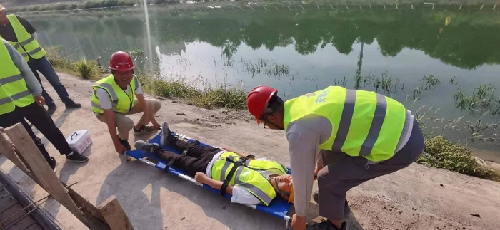 固鎮(zhèn)三八河景觀工程項(xiàng)目部根據(jù)本項(xiàng)目臨近水邊的作業(yè)特點(diǎn)開展了防溺水應(yīng)急救援演練,模擬現(xiàn)場人員發(fā)生溺水,項(xiàng)目部立即組織人力搶救上岸。立即清除口、鼻中的污泥、雜草,保持呼吸道通暢。并進(jìn)行胸外按壓及人工呼吸,120救護(hù)車及時(shí)到場后送往醫(yī)院搶救,通過防溺水演練增強(qiáng)了項(xiàng)目部全體員工遇到緊急情況時(shí)的應(yīng)變能力和實(shí)際操作救援處置能力。