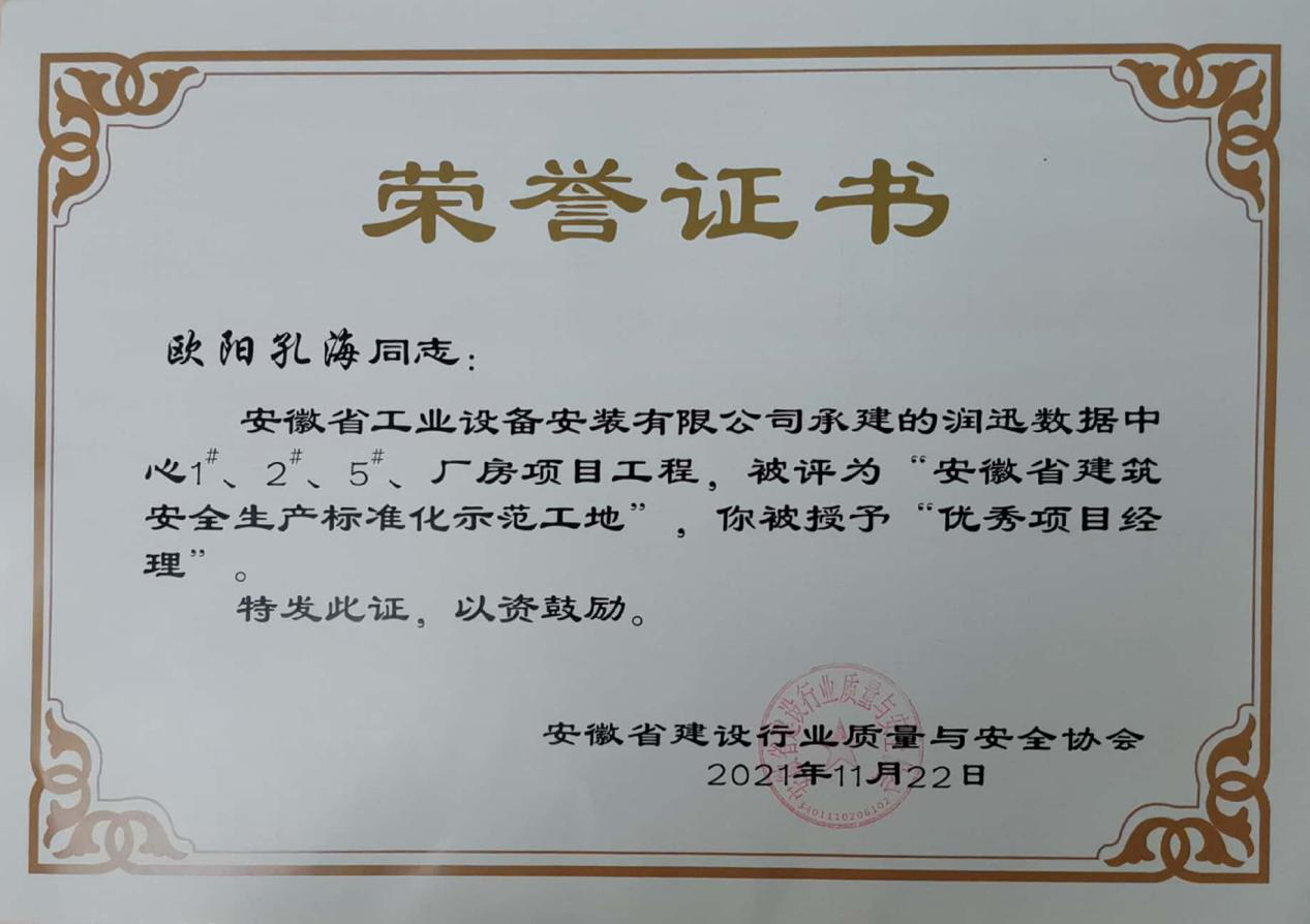 近日,安徽省工業(yè)設(shè)備安裝有限公司承建的潤迅數(shù)據(jù)中心1#、2#、5#廠房項(xiàng)目工程榮獲2021年度“安徽省建筑安全生產(chǎn)標(biāo)準(zhǔn)化示范工地”榮譽(yù)稱號(hào)。
