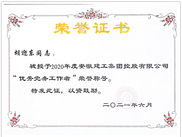 胡迎東,男,漢族,中共黨員,現(xiàn)任安徽省工業(yè)設備安裝有限公司紀檢監(jiān)察室主任。該同志從事黨務工作多年,時刻以一名優(yōu)秀共產黨員的標準來嚴格要求自己,工作中兢兢業(yè)業(yè)、勤勤懇懇、不遺余力,曾多次榮獲集團優(yōu)秀黨務工作者、公司優(yōu)秀共產黨員和優(yōu)秀黨務工作者等光榮稱號,出色地完成公司黨委賦予其優(yōu)秀黨務工作者的光榮任務,為公司黨建工作發(fā)展作出了積極的貢獻,是大家公認的崗位能手,深受公司領導干部和職工群眾的一致好評。