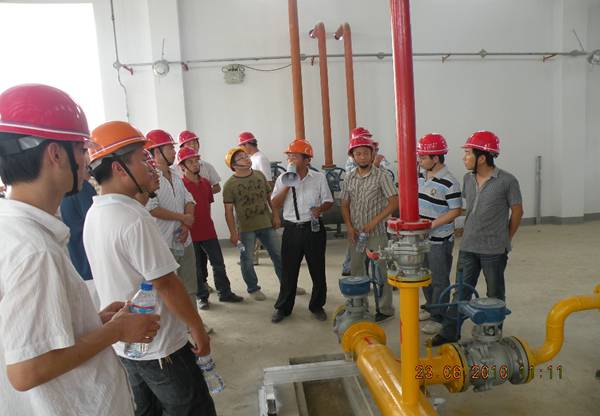 觀摩開(kāi)始前,戴書(shū)記及包處長(zhǎng)進(jìn)行動(dòng)員講話,要求大學(xué)生一定要認(rèn)真聽(tīng)講,珍惜這次觀摩學(xué)習(xí)的機(jī)會(huì)。項(xiàng)目部經(jīng)理趙永峰詳細(xì)介紹了工程概況及項(xiàng)目部對(duì)本工程的現(xiàn)場(chǎng)管理和安全生產(chǎn)、文明施工管理情況。業(yè)主周工對(duì)合成車間一、合成車間二的管道走向及工藝流程一一向大家講解,并對(duì)公用部分的設(shè)備功能逐一進(jìn)行了詳細(xì)的介紹。項(xiàng)目部鄭圣軍和徐松同志分別介紹了工藝管道、設(shè)備安裝和電氣安裝的相關(guān)流程。講解人講解細(xì)致,大學(xué)生們聽(tīng)得認(rèn)真。