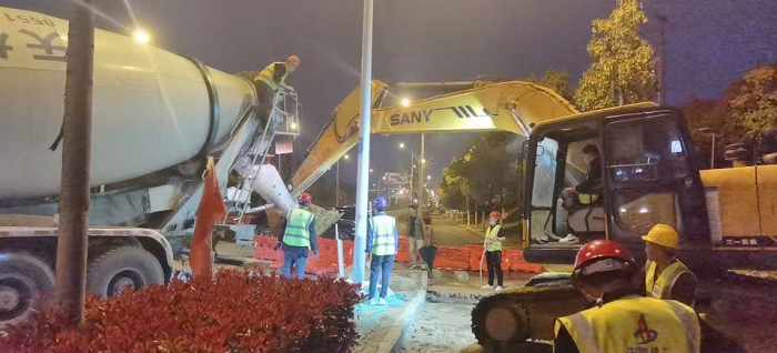 花園大道項目部為保證了白天道路正常通行不受影響,項目全體員工晚間加班加點進行過路段管道施工